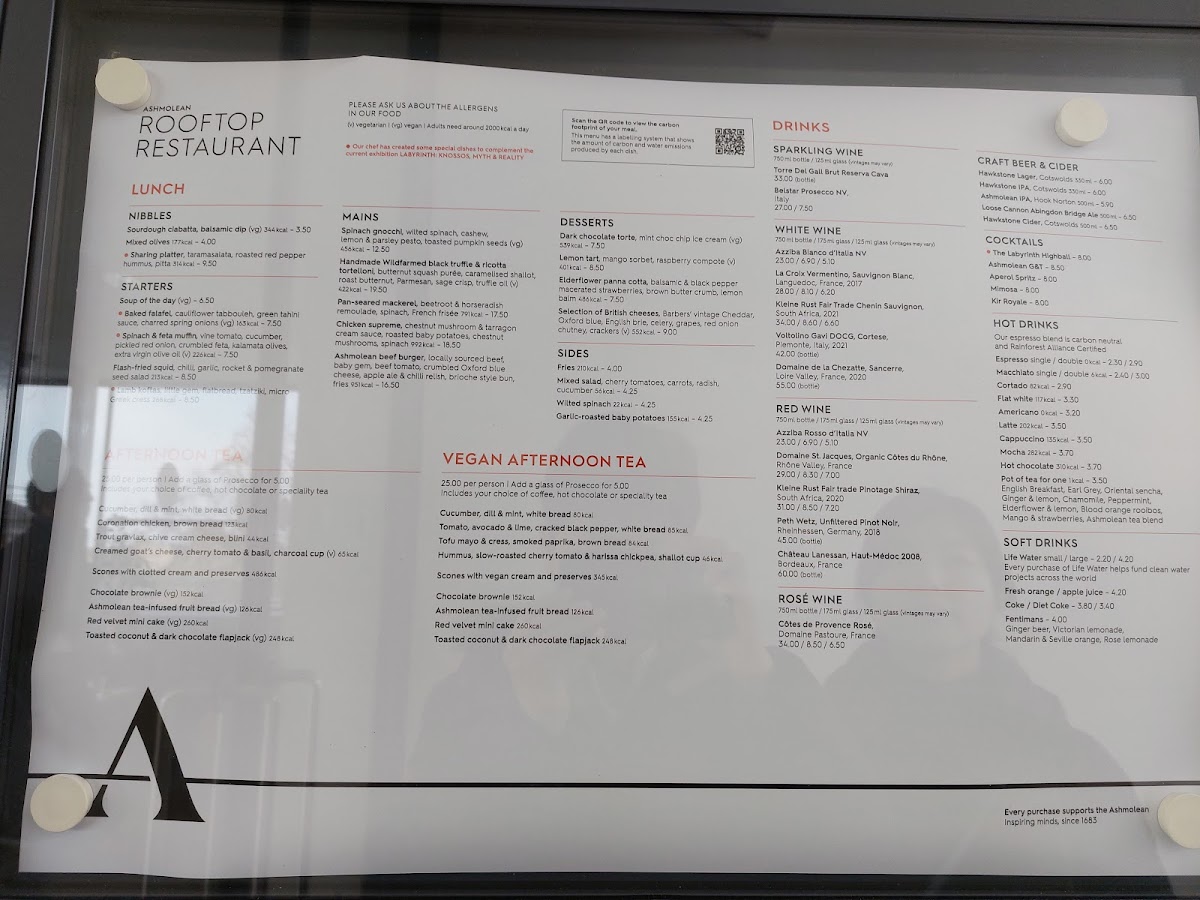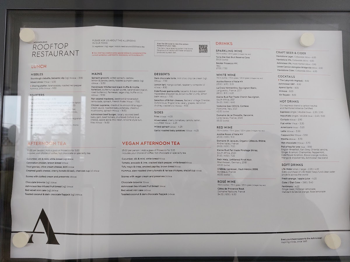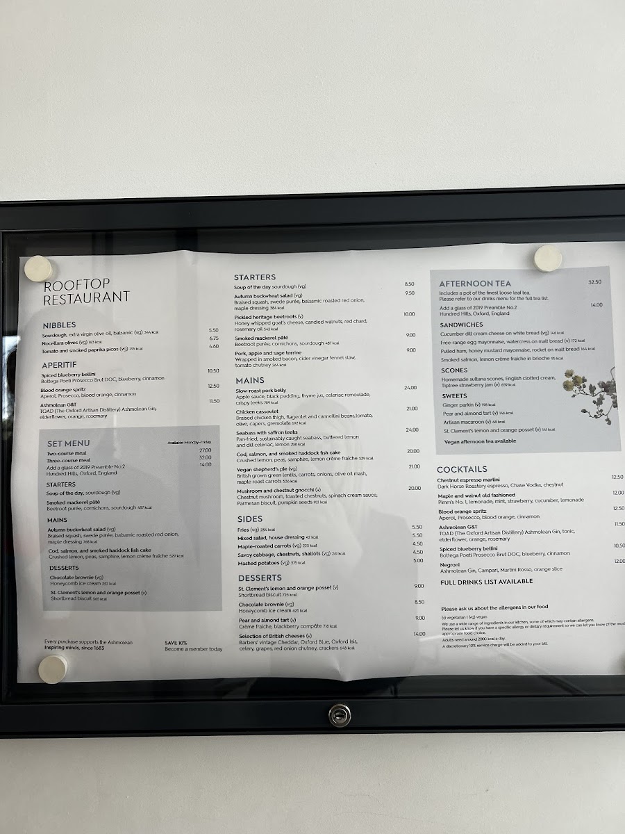 The menu at Ashmolean Rooftop Restaurant offers a thoughtfully curated selection that balances classic British fare with light, contemporary touches. It feels approachable yet refined, well suited to the relaxed rooftop setting overlooking Oxford’s historic streets.