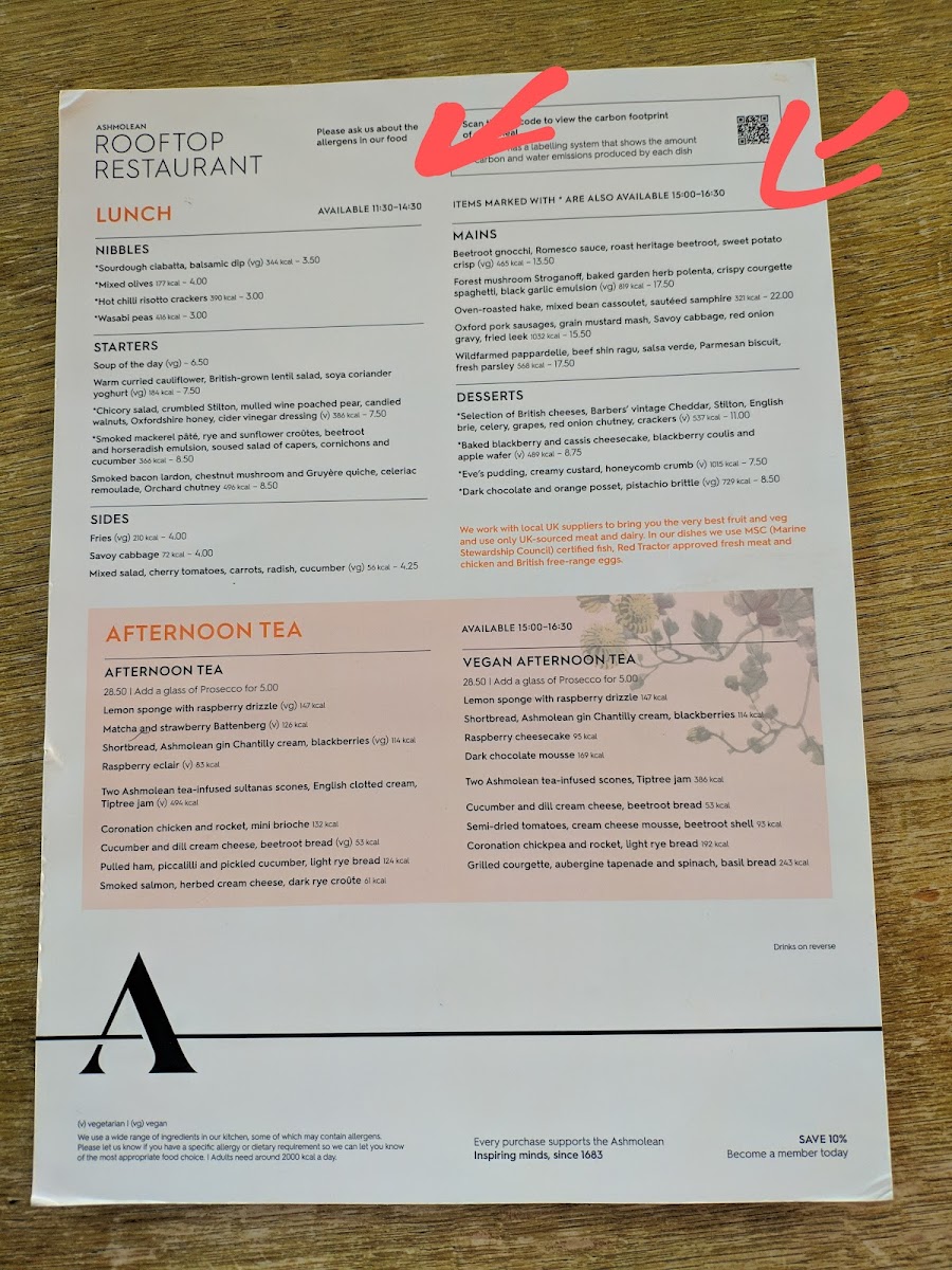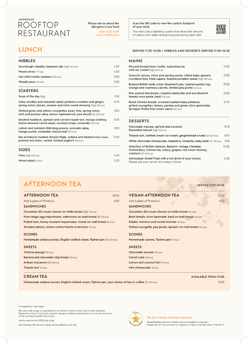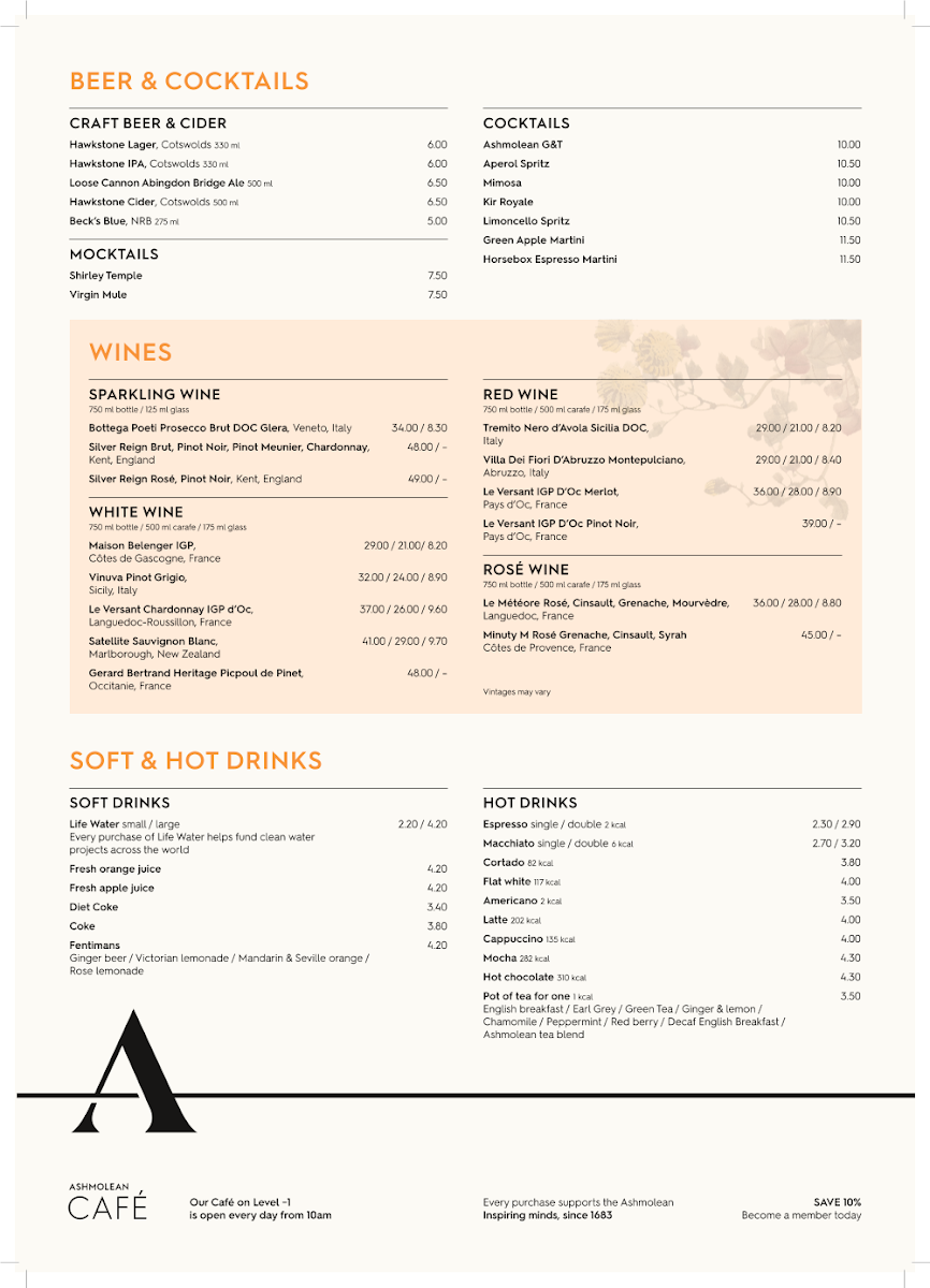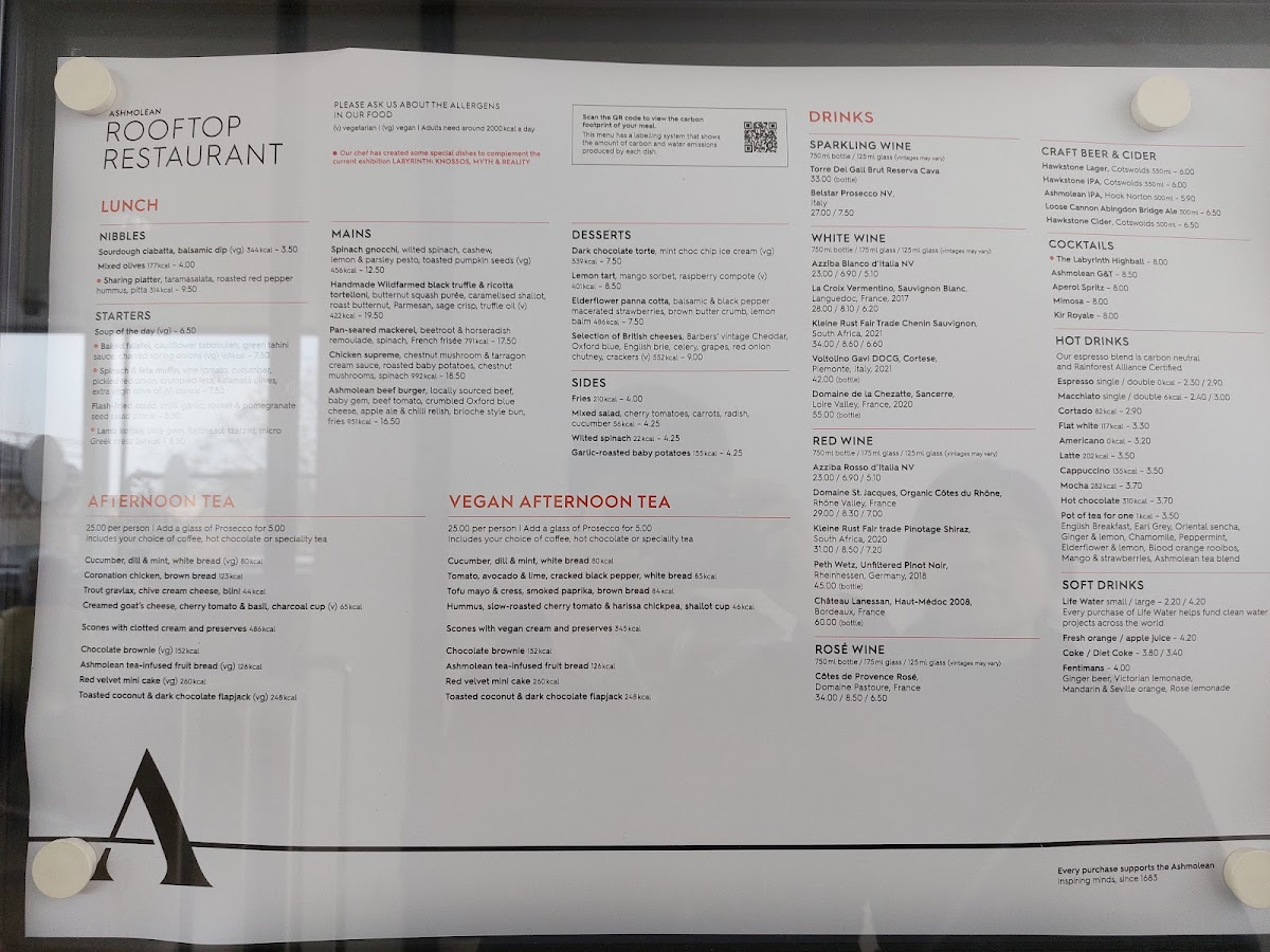 The menu at Ashmolean Rooftop Restaurant offers a thoughtfully curated selection that balances classic British fare with light, contemporary touches. It feels approachable yet refined, well suited to the relaxed rooftop setting overlooking Oxford’s historic streets.